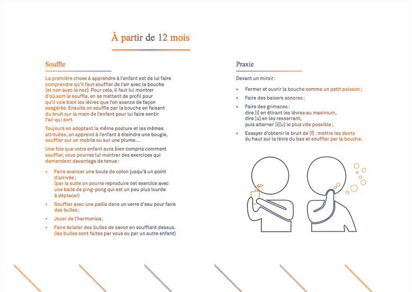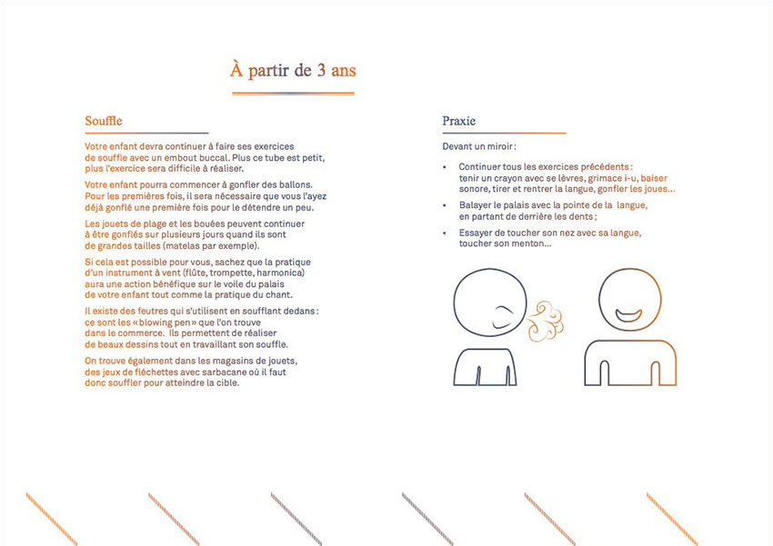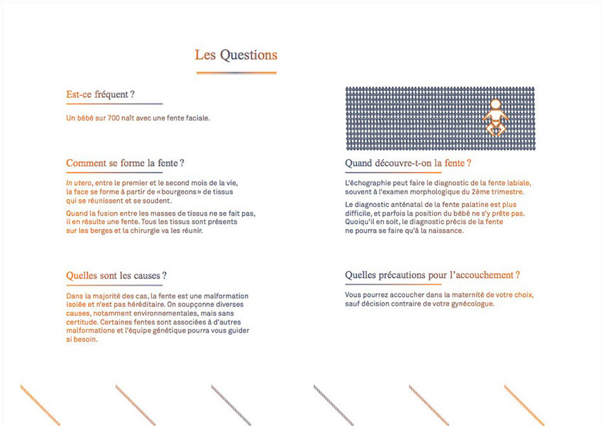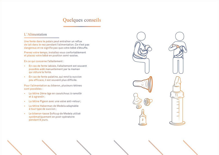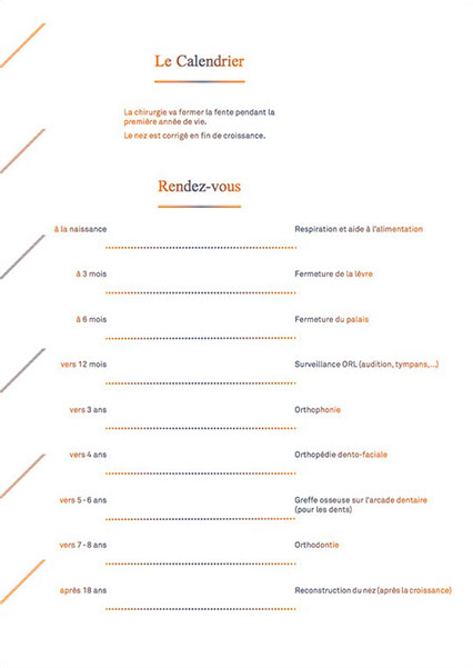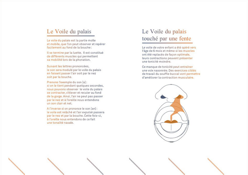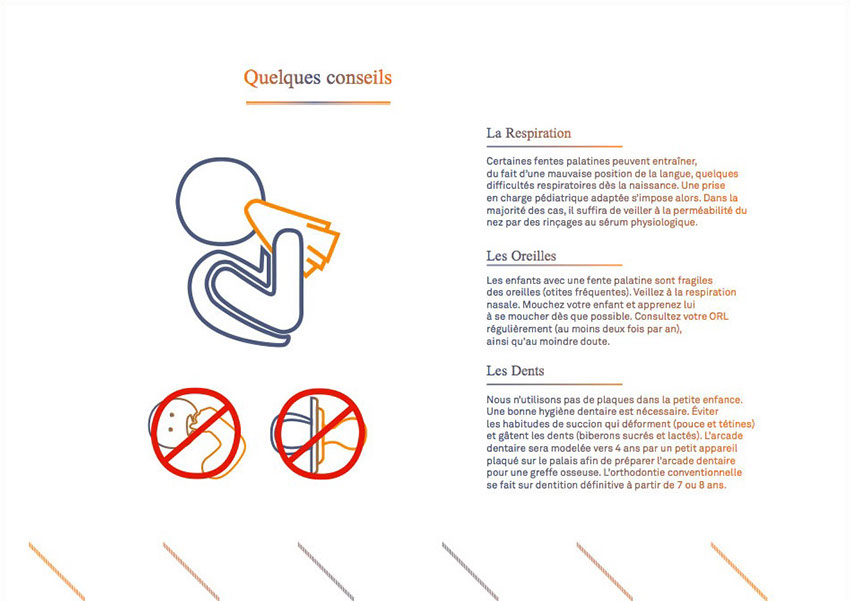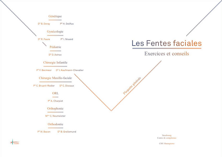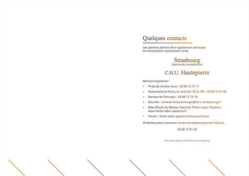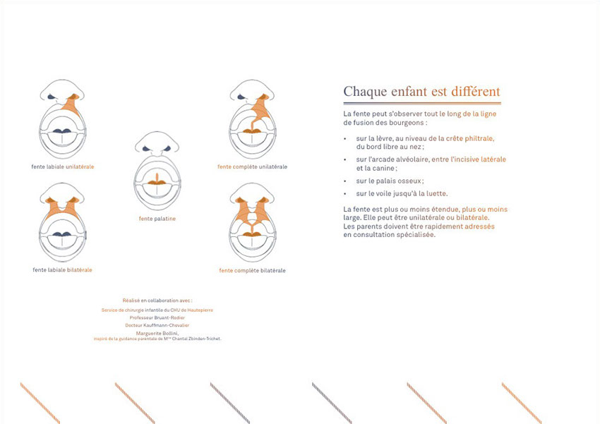 Ce livret est le dernier outil d'information sur les fentes faciales que j'ai réalisé. Il est destiné aux parents des enfants atteints d'une fente faciale. Il se compose d'une partie explicative décrivant les différentes formes de fentes faciales, des questions fréquemment posées par les parents, de conseils pratiques et d'exercices à effectuer à la maison. Il liste les contacts utiles de l'hôpital de Hautepierre et de l'hôpital universitaire de Strasbourg. Au centre du livret, on trouve également un feuillet servant de calendrier des rendez-vous avec les différentes étapes qui peuvent toucher l'enfant.