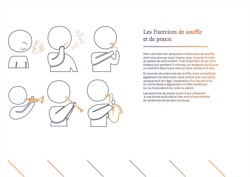 Pour les familles des enfants atteints d'une fente palatine, vélaire ou complète, une fiche additionnelle d'information a été réalisée. Il comporte d'autres exercices à effectuer à la maison en fonction de l'âge de l'enfant, des conseils sur l'alimentation, la respiration, la praxie... Elle a été réalisée en janvier 2014 à partir des données et des textes de Marguerite Bollini.