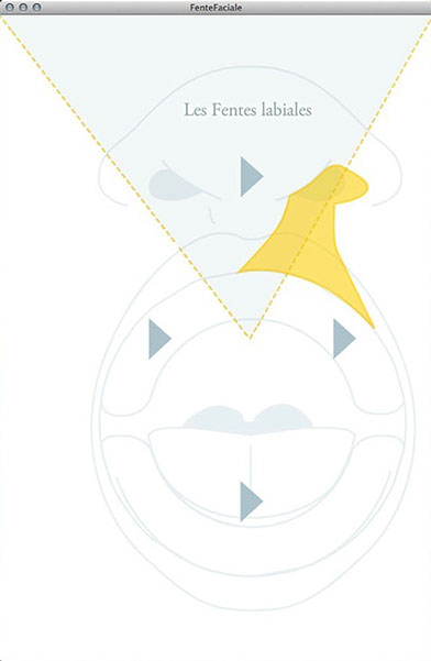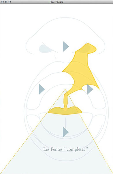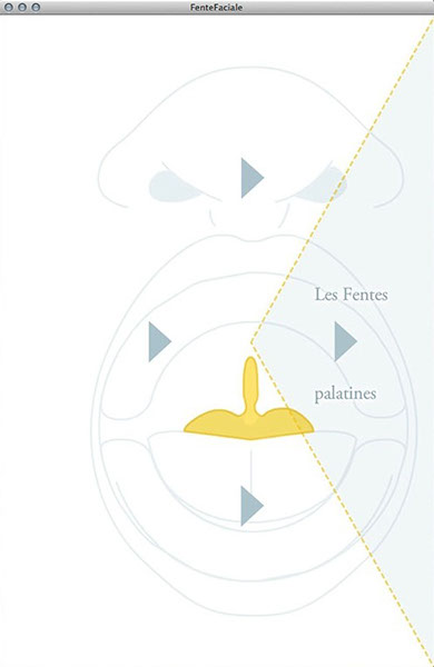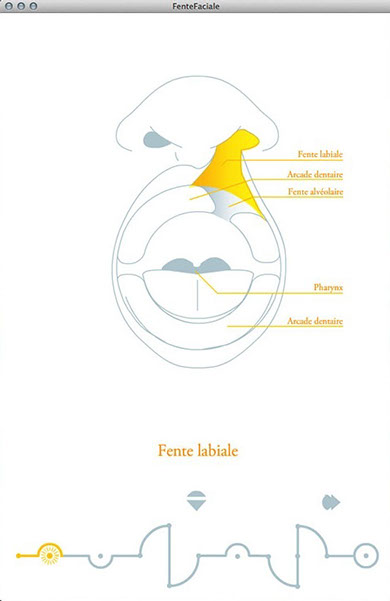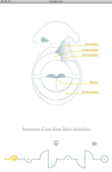 Il propose à partir d'un menu le choix entre quatre pathologies, les fentes labiales, les fentes labio-alvéolaires, les fentes palatines et les fentes dites "complètes". Chacune se compose d'une première partie anatomique et des différentes étapes opératoires, jusqu'à la cicatrisation. La barre de progression et les boutons offrent une navigation simplifiée et la possibilité de revenir à tout moment sur n'importe quelle étape.