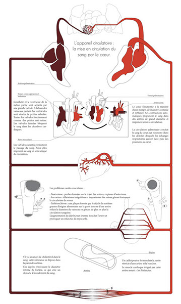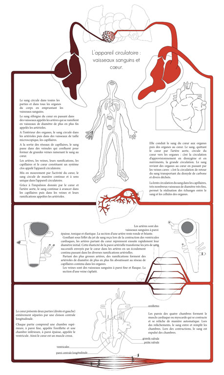Ce support d'aide pédagogique au cours de biologie sur le thème de la circulation sanguine est destiné aux élèves de 3e de collège. Il s'agissait de créer un support attractif regroupant l'ensemble des cours portant sur le système sanguin sur deux feuilles A4, et pouvant être décliné au format de deux affiches A3. Il a été créé en avril 2011. Le cadre en artère et veine permet d'avoir une première impression du système. Ce cadre comporte sur la ligne médiane, le cœur séparé en deux afin de prendre conscience à la fois du cycle fermé de la circulation sanguine, du foie, de l'estomac et d'un muscle, et de la différence entre riche et pauvre en oxygène.