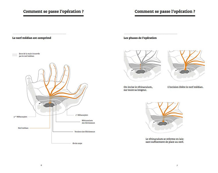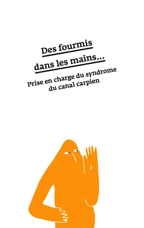 Ce livret d'information aux patients a été réalisé en collaboration avec Abel Cribier et d'Helen Bün. Il s'agit d'un livret d'information sur le traitement du syndrome du canal carpien. Il comporte une première partie sur les détails avant l'opération, une partie sur le jour de l'intervention, une suivante sur le déroulement du jour de l'intervention, une affiche sur la douche au savon antiseptique et une partie sur les suites post-opératoires. Il est en lien avec l'application et reprend les illustrations de cette dernière pour la partie sur le déroulement du jour de l'intervention. Les autres illustrations sont d'Helen Bün, la mise en page est d'Abel Cribier.